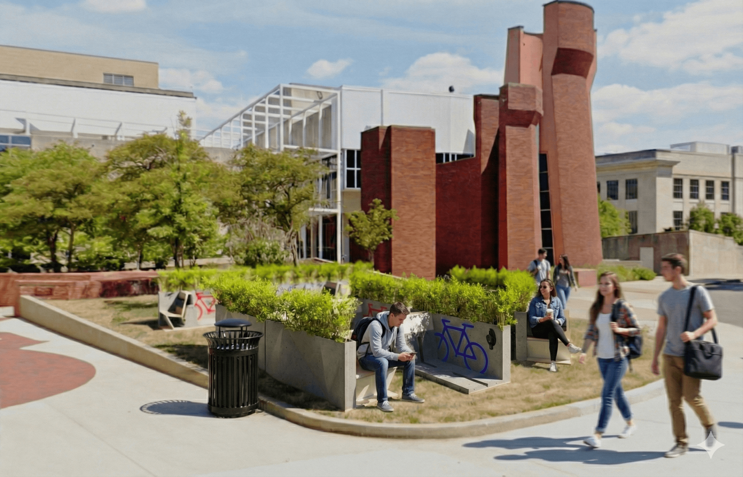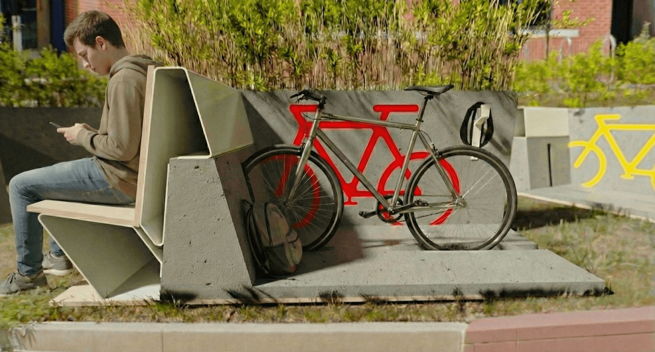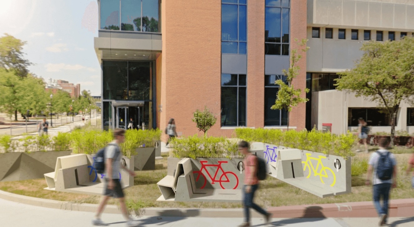 The rack features a seat on the opposite side of the front wheel slot, as well as a planter on the side of the rack, which offsets the green space taken away from each rack, and also adds increased privacy for the seat.