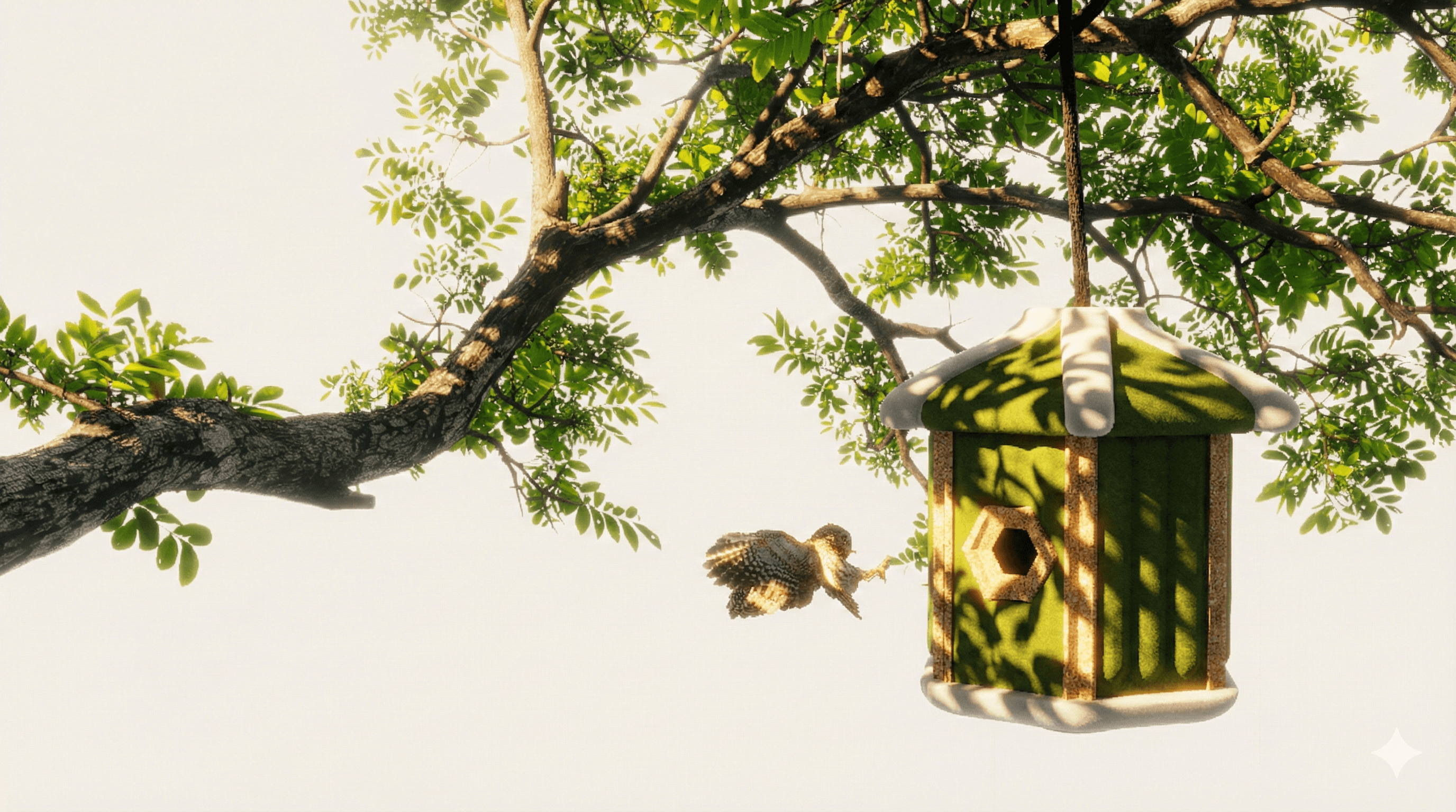An important part of this project was to master lighting and in creating a visual that appeared real. I experimented with duplication and key lights in this project to create some "professional shots". As seen on the right, I rendered the background branch with the birdhouse in Keyshot, and added the bird later in Photoshop.